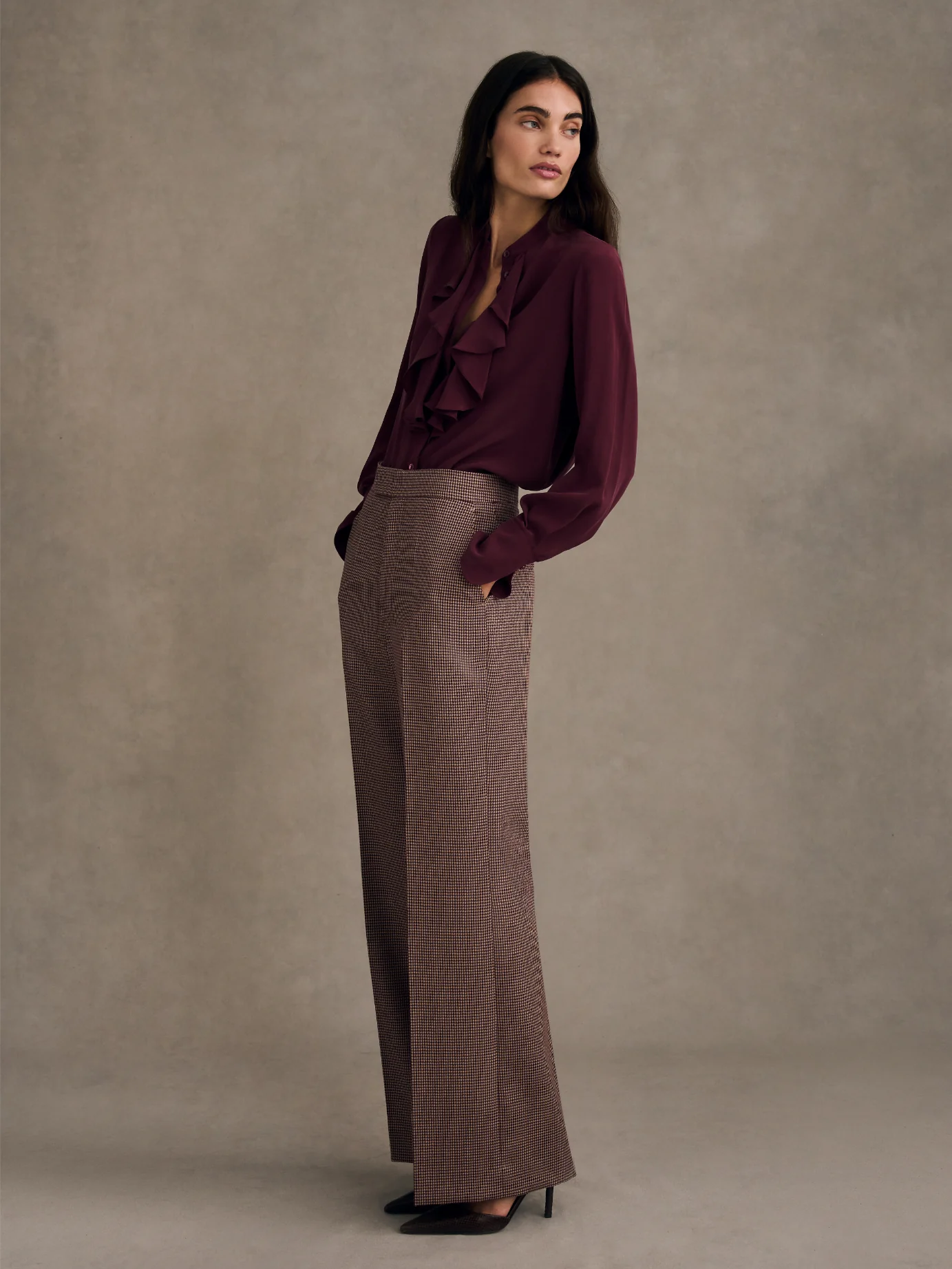 Cut in 100% silk crepe de chine, this interpretation of the Cascade brings a lighter, matte softness to the silhouette. The cascading ruffle draws a fluid line through the front, balanced by the elongated cuff and refined detailing that give the blouse its quiet structure. An understated, modern expression of a Knatchbull signature.
