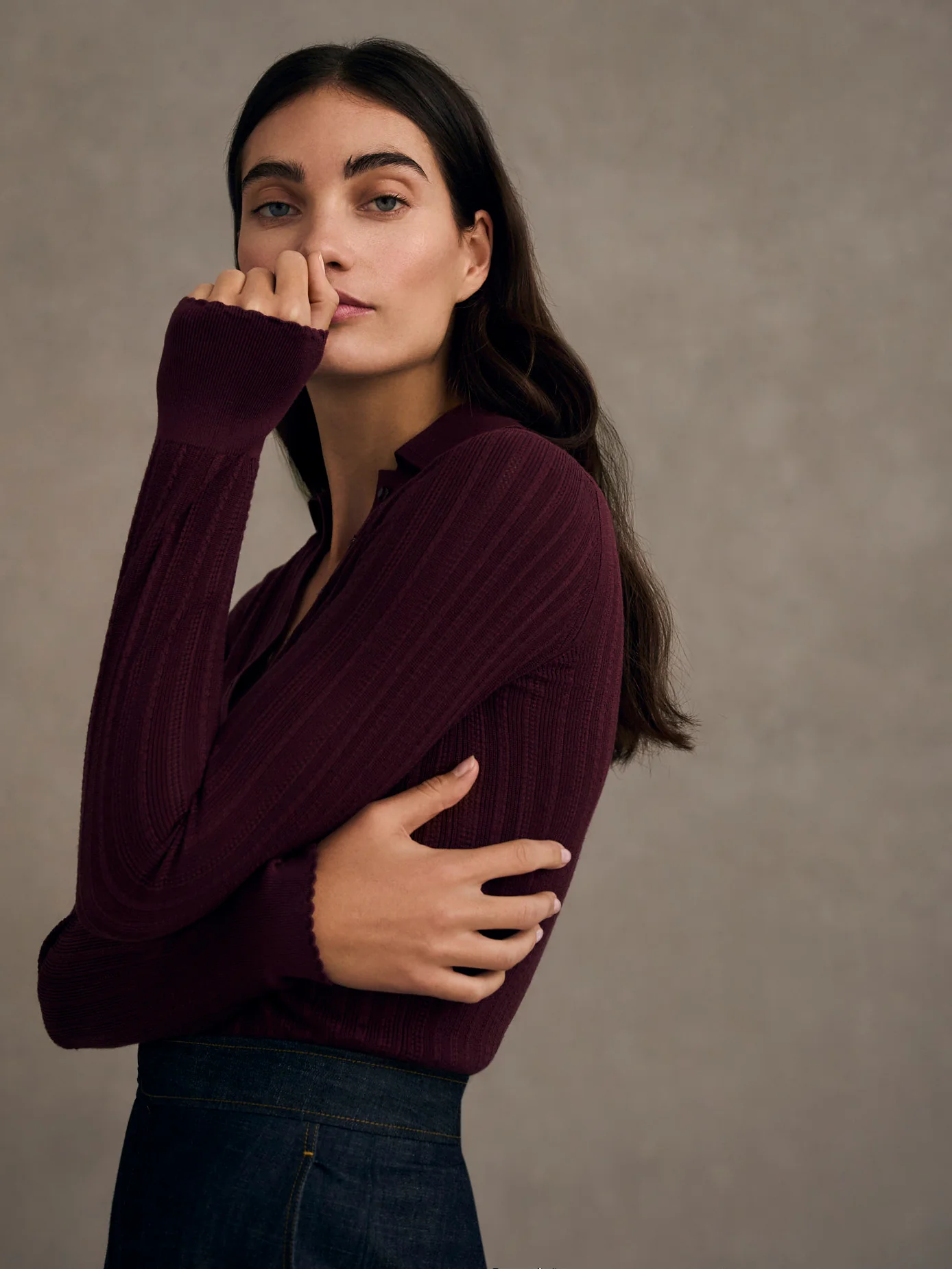 This fine gauge polo has been knitted in a delicate pointelle stitch using pure silk yarn. Designed to perfection, it features a flat-laying knitted collar and an elongated placket with Italian mother-of-pearl buttons for an elegant, delicate finish. The sleeve rib is finished with a subtle scalloped stitch. This style works seamlessly with our trousers or can be equally well paired with our skirts.