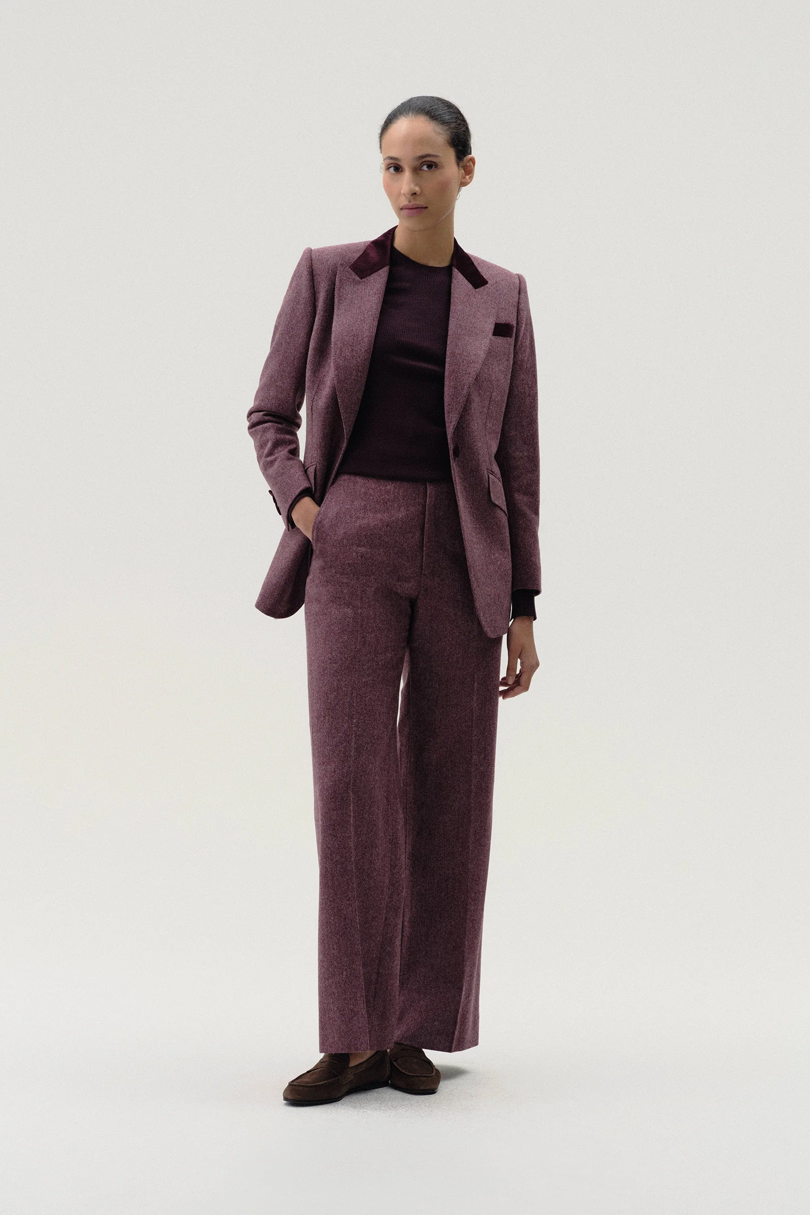 Our iconic Single-Breasted, Peak Lapel Jacket has been reimagined and recrafted in a classic wool, woven in a heritage herringbone pattern with touches of cotton velvet at the collar, chest pocket, and buttons. This Single Breasted Jacket is fitted to define the waist. Angled pockets with flaps are placed to elongate the torso, achieving the most flattering fit. Versatile and timeless, this jacket can be worn as a full suit or more casually as a separate piece.