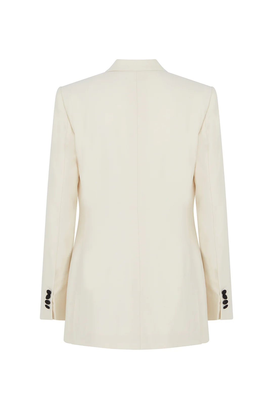 - Elongating angled side pockets feature, together with a single silk satin fabric-covered button at the front.