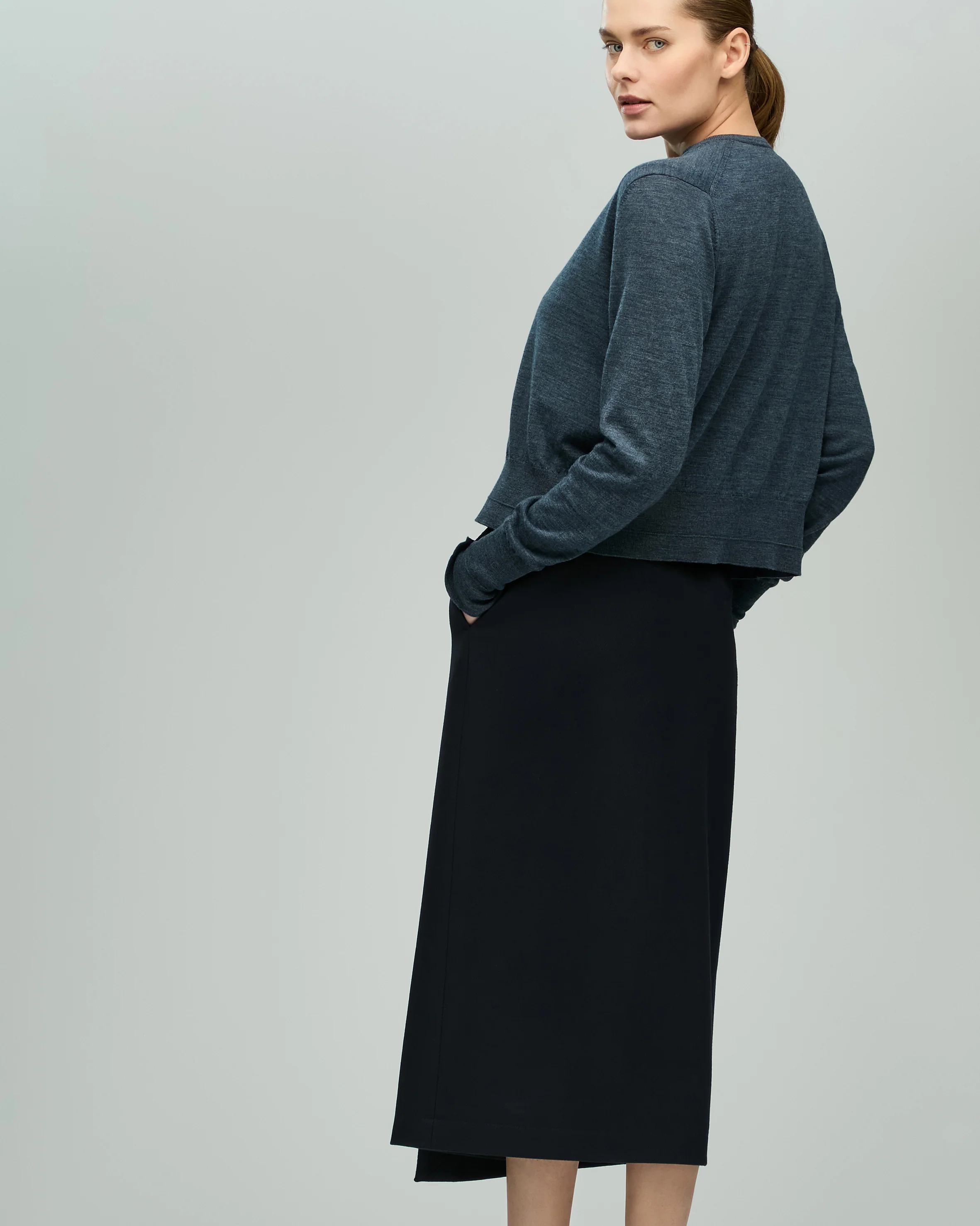 - A midi-length wrap skirt spun from a lighter weight 100% wool twill.